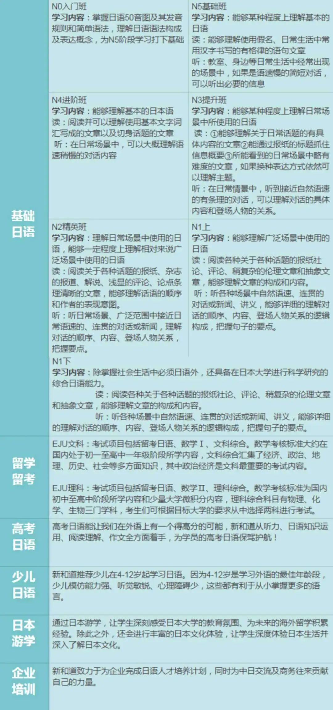 新和道日本語私塾有包括多級別的基礎日語教學課程、EJU留學、高考日語、少兒日語等課程,同時也有針對日本留學和日企交流等多方面的文化體驗培訓課程。