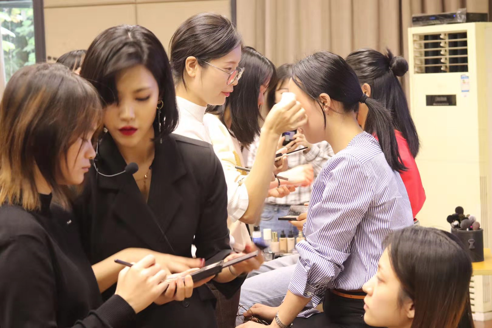 早就躍躍欲試的同學們紛紛拿起了化妝刷,兩兩配對進行了現場實操練習。認真的金老師在旁邊細心指導 。